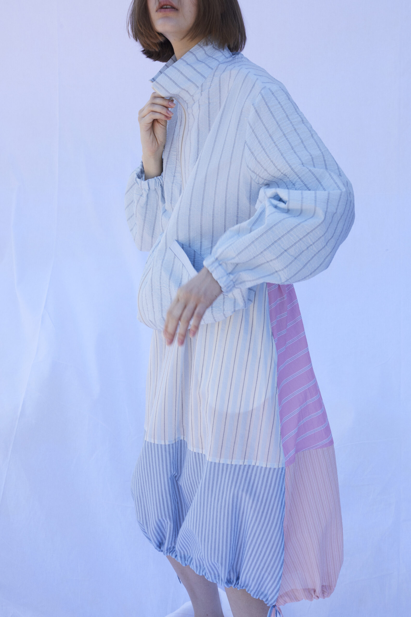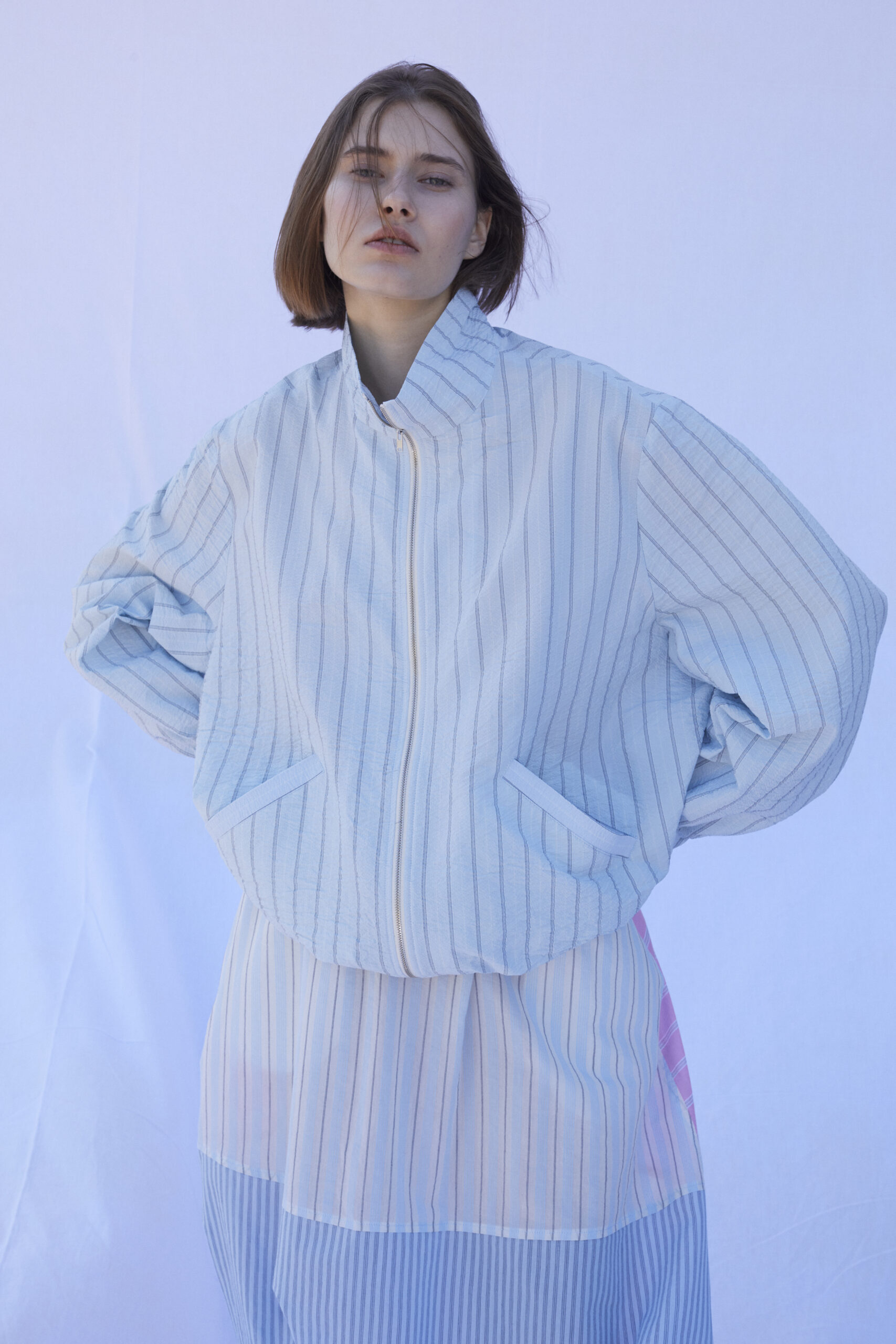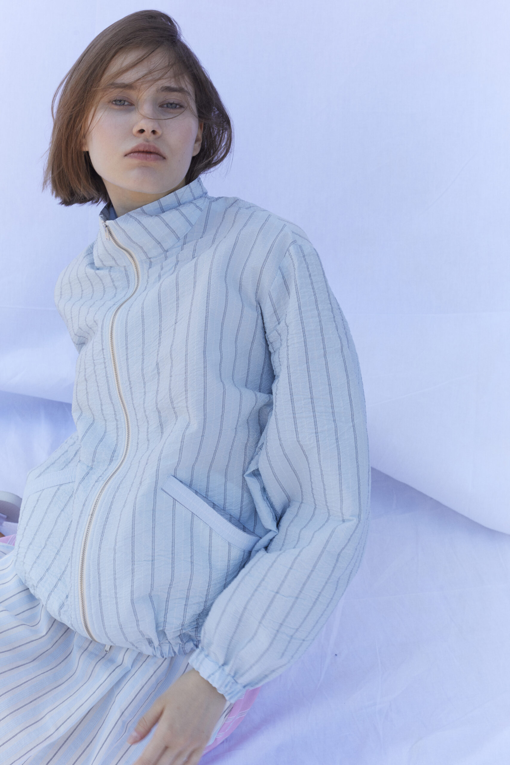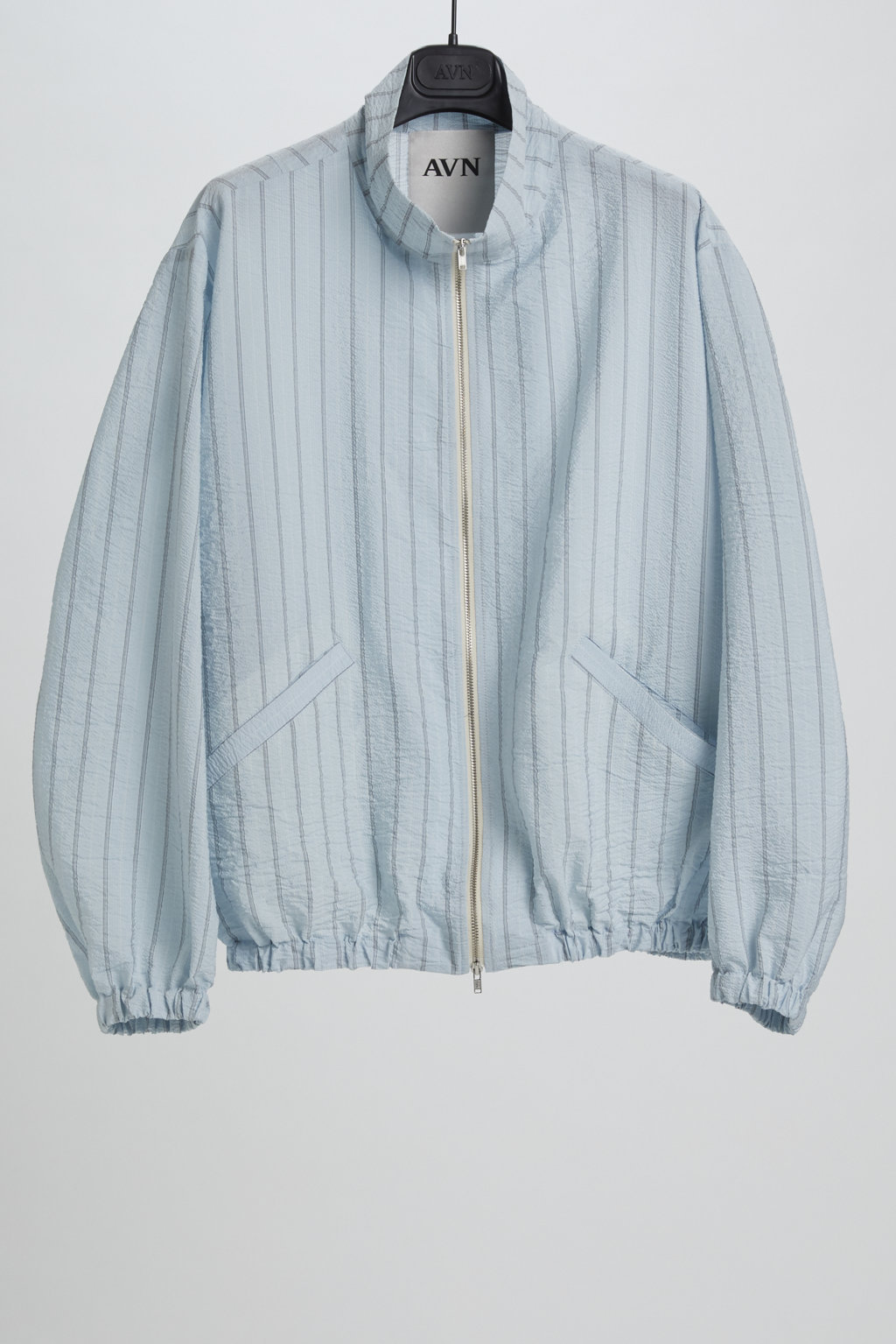 Long sleeves bomber with stand up neck and zip closure.