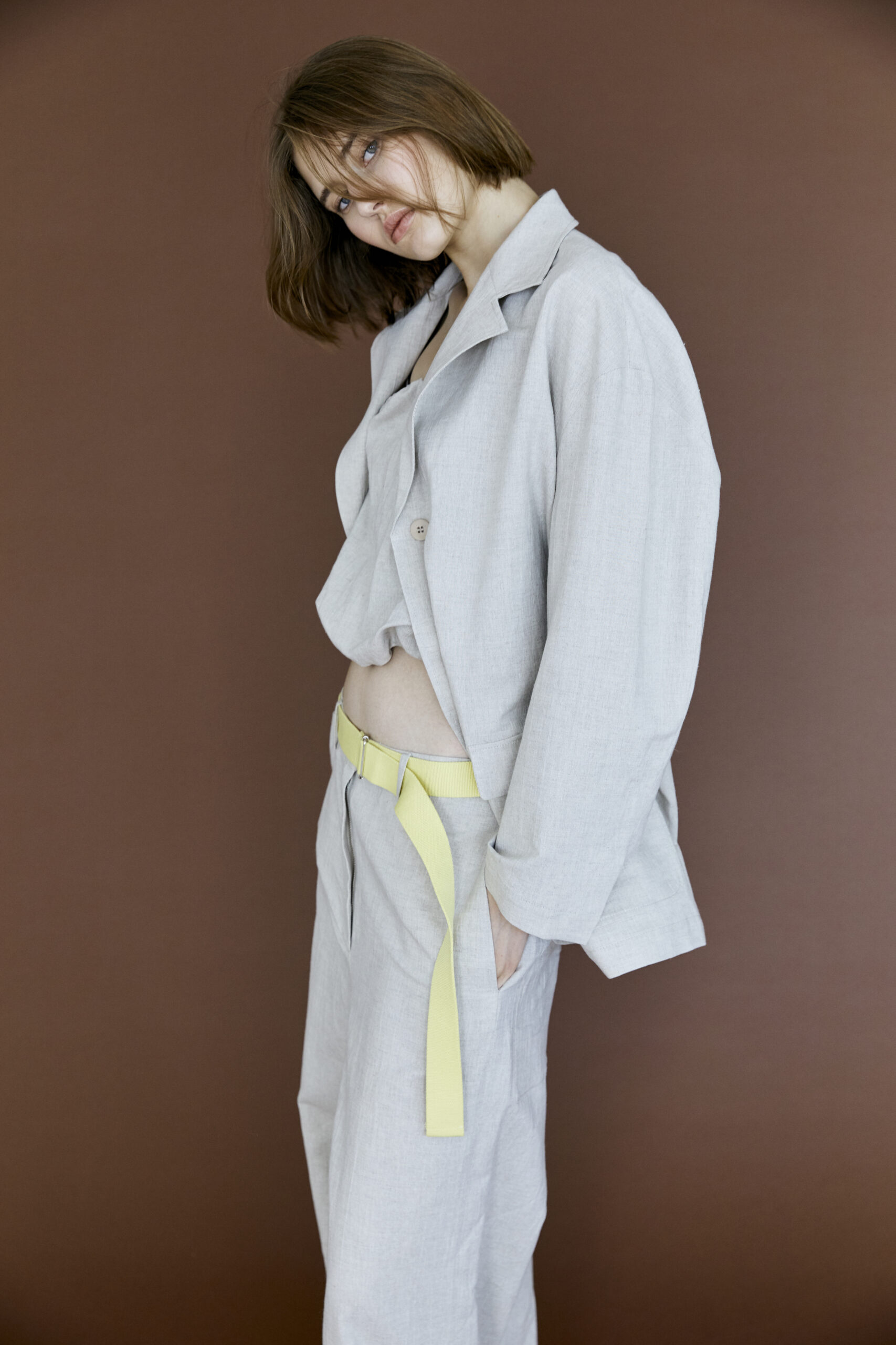Large leg straight pants with ribbon belt.